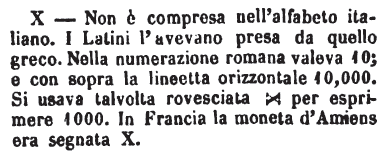 | X - Non è compresa nell'alfabeto italiano. I Latini l'avevano presa da quello greco. Nella numerazione romana valeva 10; e con sopra la lineetta orizzontale 10,000. Si usava talvolta rovesciata per esprimere 1000. In Francia la moneta d'Amiens era segnata X. [immagine] |