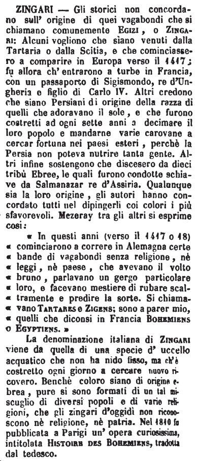 «In questi anni (verso il 1417 o 18) cominciarono a correre in Alemagna certe bande di vagabondi senza religione, né leggi, né paese, che avevano il volto bruno, parlavano un gergo particolare loro, e facevano mestiere di rubare scaltramente e predire la sorte. Si chiamavano Tartares e Zigens; sono a parer mio, quelli che diconsi in Francia Bohemiens o Egyptiens.» La denominazione italiana di Zingari viene da quella di una specie d'uccello acquatico che non ha nido fisso, ma ch'è costretto ogni giorno a cercare nuovo ricovero. Benchè coloro siano di origine ebrea, pure si sono formati di un tal miscuglio di diversi popoli e di varie religioni, che gli zingari d'oggidì non riconoscono né religione, né patria. Nel 1810 fu pubblicata a Parigi un'opera curiosissima, intitolata Histoire des Bohemiens, tradotta dal tedesco. [immagine] |