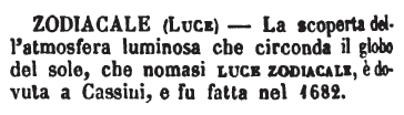 | Zodiacale (Luce) - La scoperta dell'atmosfera luminosa che circonda il globo del sole, che nomasi luce zodiacale, è dovuta a Cassini, e fu fatta nel 1682. [immagine] |
