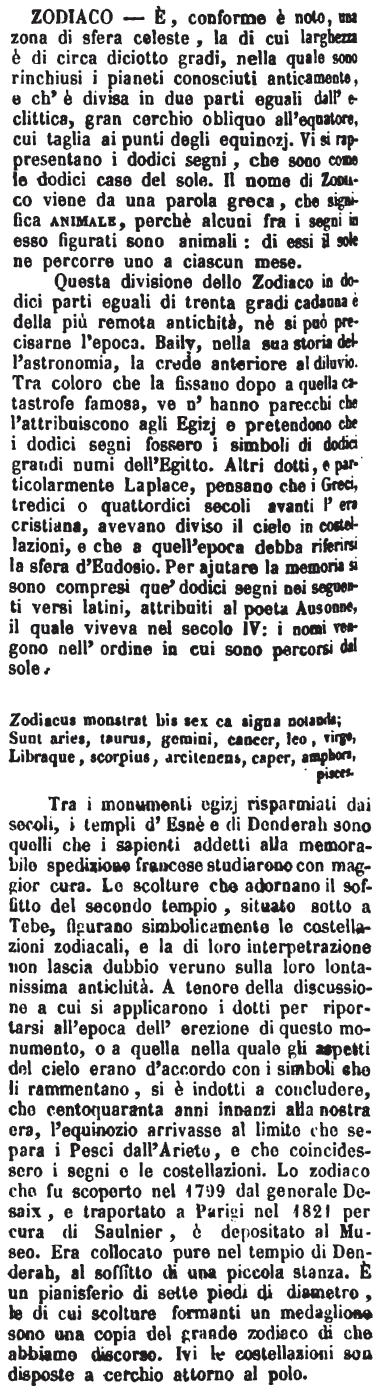 Questa divisione dello Zodiaco in dodici parti eguali di trenta gradi cadauna è della più remota antichità, nè si può precisarne l'epoca. Baily, nella sua storia dell'astronomia, la crede anteriore al diluvio. Tra coloro che la fissano dopo a quella catastrofe famosa, ve n'hanno parecchi che l'attribuiscono agli Egizj e pretendono che i dodici segni fossero i simboli di dodici grandi numi dell'Egitto. Altri dotti, e particolarmente Laplace, pensano che i Greci, tredici o quattordici secoli avanti l'era cristiana, avevano diviso il cielo in costellazioni, e che a quell'epoca debba riferirsi la sfera d'Eudosio. Per ajutare la memoria si sono compresi que' dodici segni nei seguenti versi latini, attribuiti al poeta Ausonne, il quale viveva nel secolo IV: i nomi vengono nell'ordine in cui sono percorsi dal sole: Zodiacus monstrat bis sex ca signa notanda; Sunt aries, taurus, gemini, cancer, leo, virgo, Libraque, scorpius, arcitenens, caper, amphora, pisces. Tra i monumenti egizj risparmiati dai secoli, i templi d'Esnè e di Denderah sono quelli che i sapienti addetti alla memorabile spedizione francese studiarono con maggior cura. Le scolture che adornano il soffitto del secondo tempio, situato sotto a Tebe, figurano simbolicamente le costellazioni zodiacali, e la di loro interpretazione non lascia dubbio veruno sulla loro lontanissima antichità. A tenore della discussione a cui si applicarono i dotti per riportarsi all'epoca dell'erezione di questo monumento, o a quella nella quale gli aspetti del cielo erano d'accordo con i simboli che li rammentano, si è indotti a concludere, che centoquaranta anni innanzi alla nostra era, l'equinozio arrivasse al limite che separa i Pesci dall'Ariete, e che coincidessero i segni e le costellazioni. Lo zodiaco che fu scoperto nel 1799 dal generale Desaix, e trasportato a Parigi nel 1821 per cura di Saulnier, è depositato al Museo. Era collocato pure nel tempio di Denderah, al soffitto di una piccola stanza. È un pianisferio di sette piedi di diametro, le di cui scolture formanti un medaglione sono una copia del grande zodiaco di che abbiamo discorso. Ivi le costellazioni son disposte a cerchio attorno al polo. [immagine] |