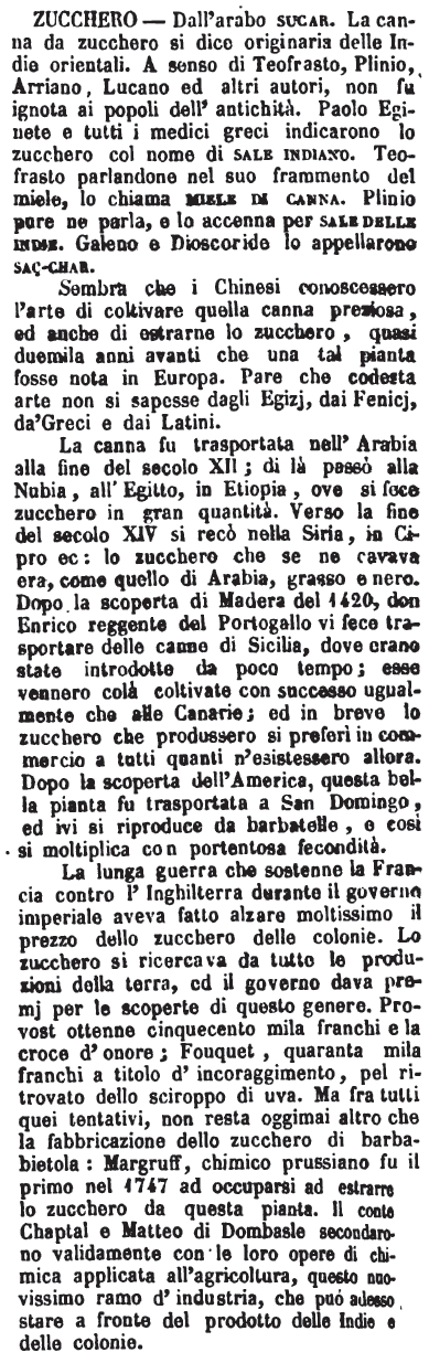 Sembra che i Chinesi conoscessero l'arte di coltivare quella canna preziosa, ed anche di estrarne lo zucchero, quasi duemila anni avanti che una tal pianta fosse nota in Europa. Pare che codesta arte non si sapesse dagli Egizj, dai Fenicj, da' Greci e dai Latini. La canna fu trasportata nell'Arabia alla fine del secolo XII; di là passò alla Nubia, all'Egitto, in Etiopia, ove si fece zucchero in gran quantità. Verso la fine del secolo XIV si recò nella Siria, in Cipro ec: lo zucchero che se ne cavava era, come quello di Arabia, grasso e nero. Dopo la scoperta di Madera del 1420, don Enrico reggente del Portogallo vi fece trasportare delle canne di Sicilia, dove erano state introdotte da poco tempo; esse vennero colà coltivate con successo ugualmente che alle Canarie; ed in breve lo zucchero che produssero si preferì in commercio a tutti quanti n'esistessero allora. Dopo la scoperta dell'America, questa bella pianta fu trasportata a San Domingo, ed ivi si riproduce da barbatelle, e così si moltiplica con portentosa fecondità. La lunga guerra che sostenne la Francia contro l'Inghilterra durante il governo imperiale aveva fatto alzare moltissimo il prezzo dello zucchero delle colonie. Lo zucchero si ricercava da tutte le produzioni della terra, ed il governo dava premj per le scoperte di questo genere. Provost ottenne cinquecento mila franchi e la croce d'onore; Fouquet, quaranta mila franchi a titolo d'incoraggimento, pel ritrovato dello sciroppo di uva. Ma fra tutti quei tentativi, non resta oggimai altro che la fabbricazione dello zucchero di barbabietola: Margruff, chimico prussiano fu il primo nel 1747 ad occuparsi ad estrarre lo zucchero da questa pianta. Il conte Chaptal e Matteo di Dombasle secondarono validamente con le loro opere di chimica applicata all'agricoltura, questo nuovissimo ramo d'industria, che può adesso stare a fronte del prodotto delle Indie e delle colonie. [immagine] |